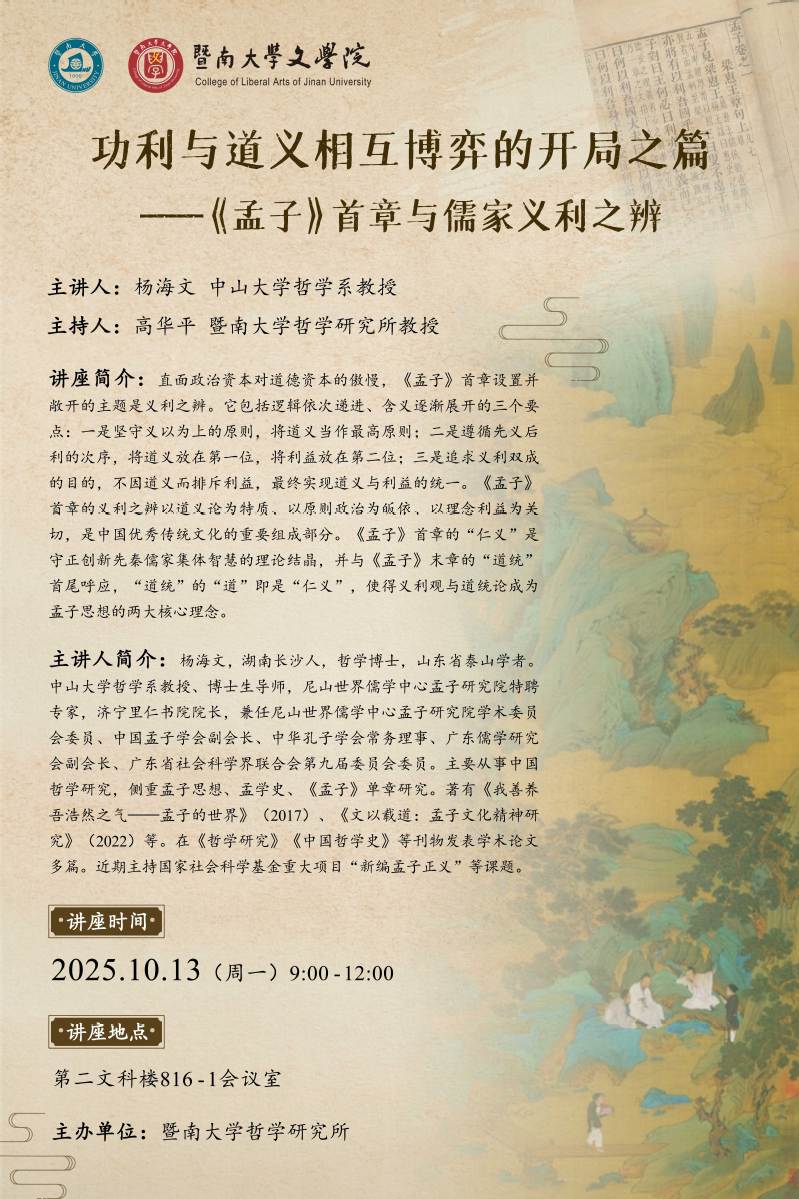 讲座预告丨功利与道义相互博弈的开局之篇——《孟子》首章与儒家义利之辨