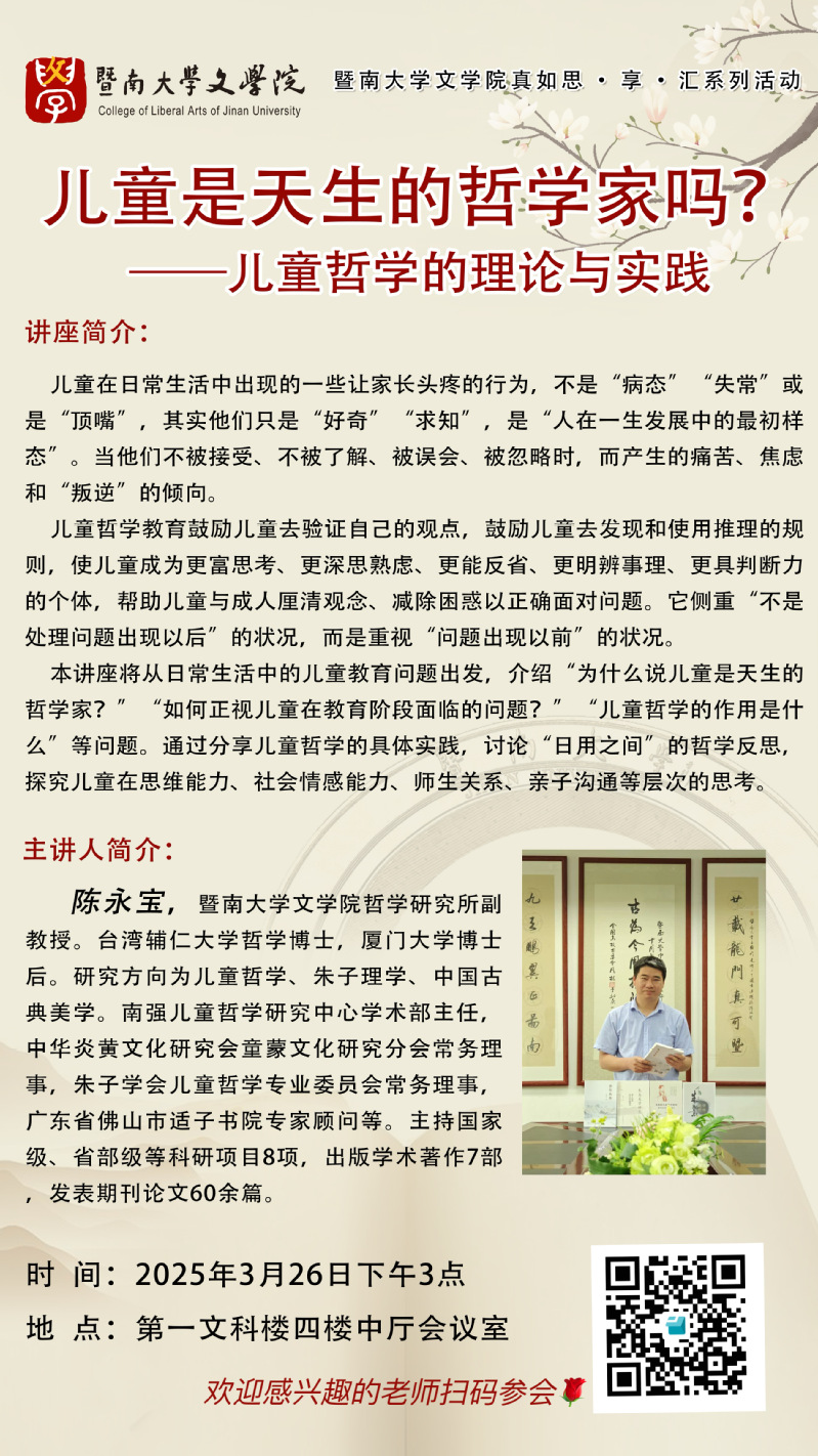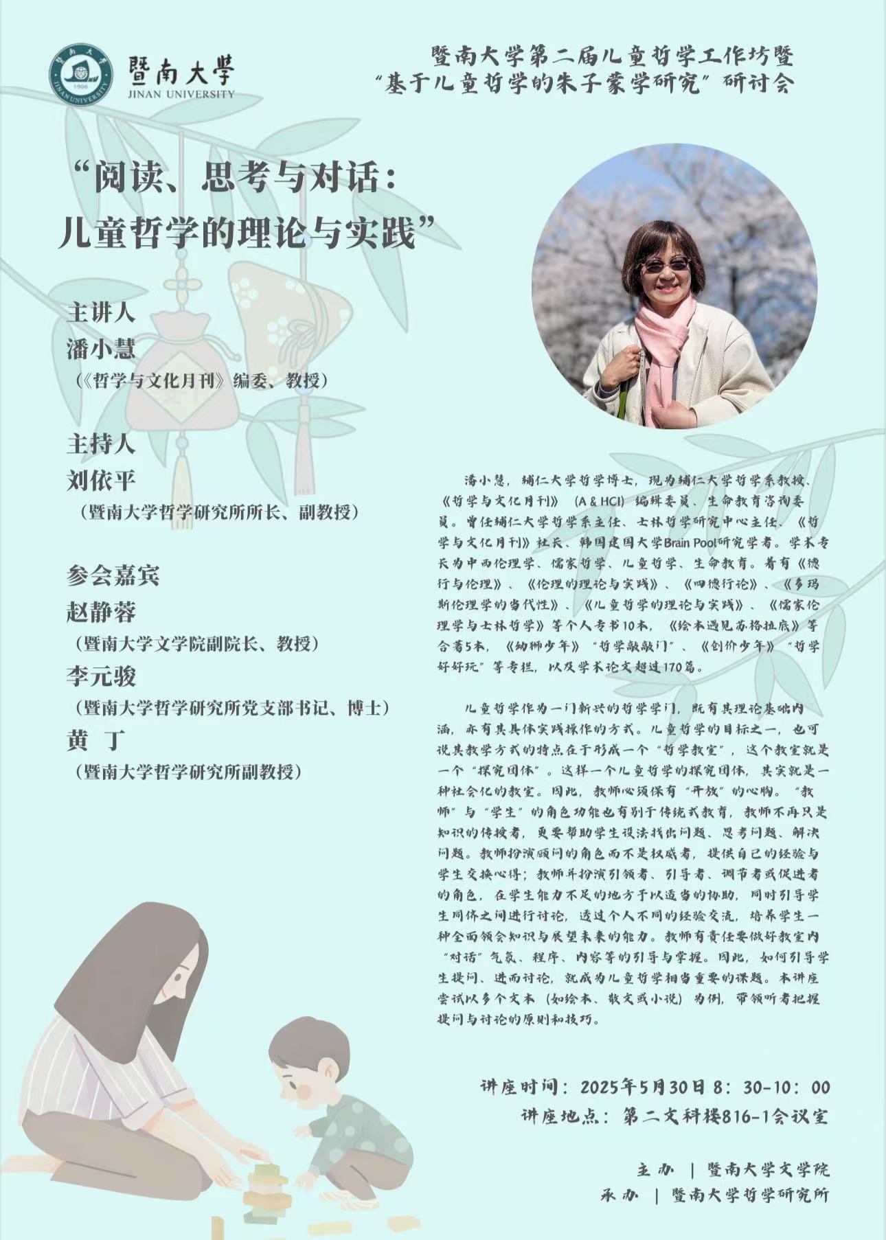 活动预告丨暨南大学第二届儿童哲学工作坊暨“基于儿童哲学的朱子蒙学研究”研讨会系列讲座